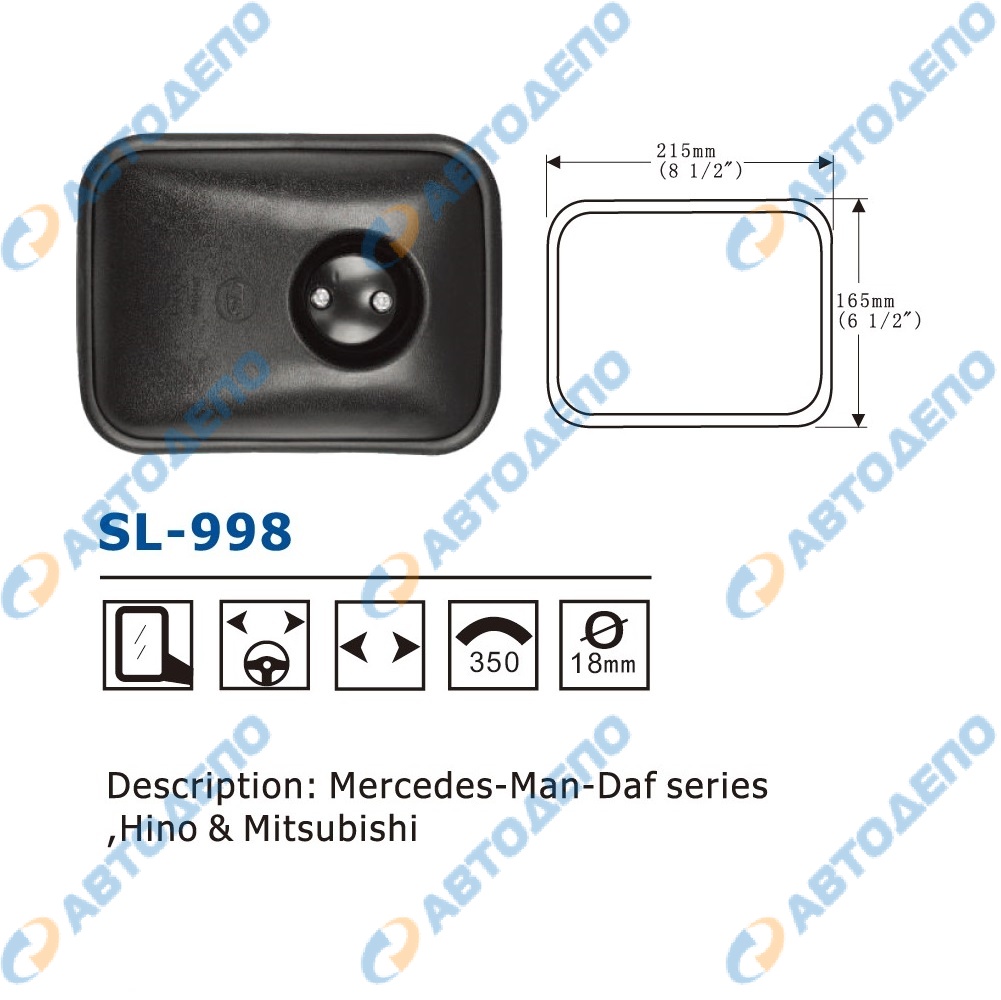 Зеркало заднего вида 215x165mm, крепление шар 18mm ( арт. SL-998 )