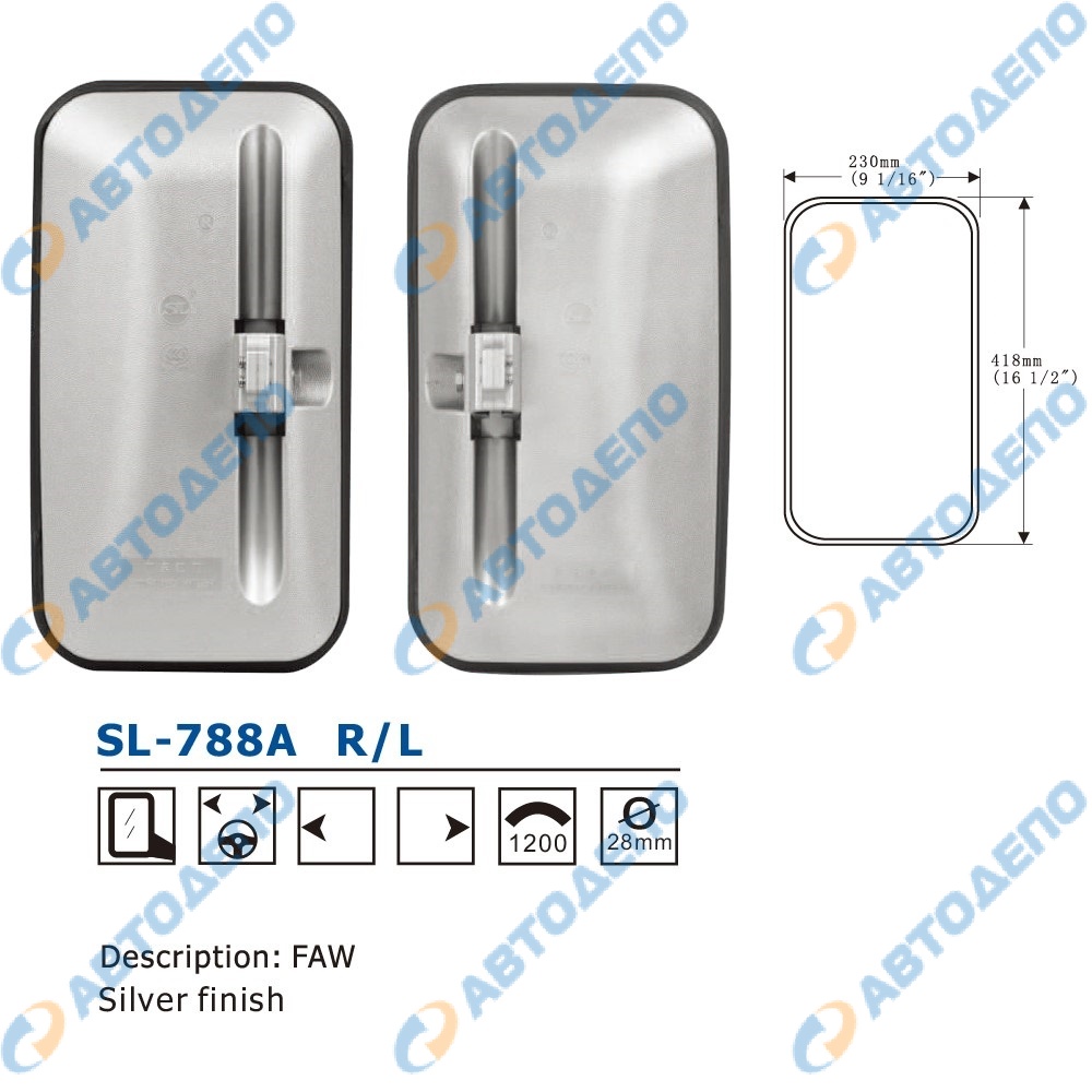 зеркало заднего вида, R сторона, 418x230mm, крепление хомут 28mm, ( арт. SL-788AR )
